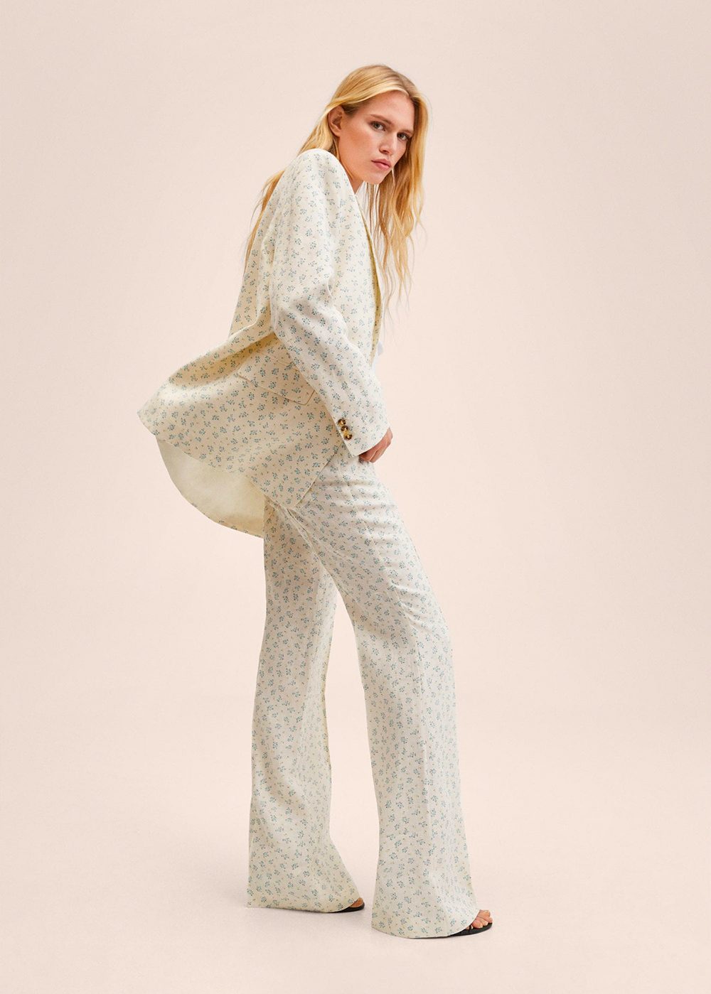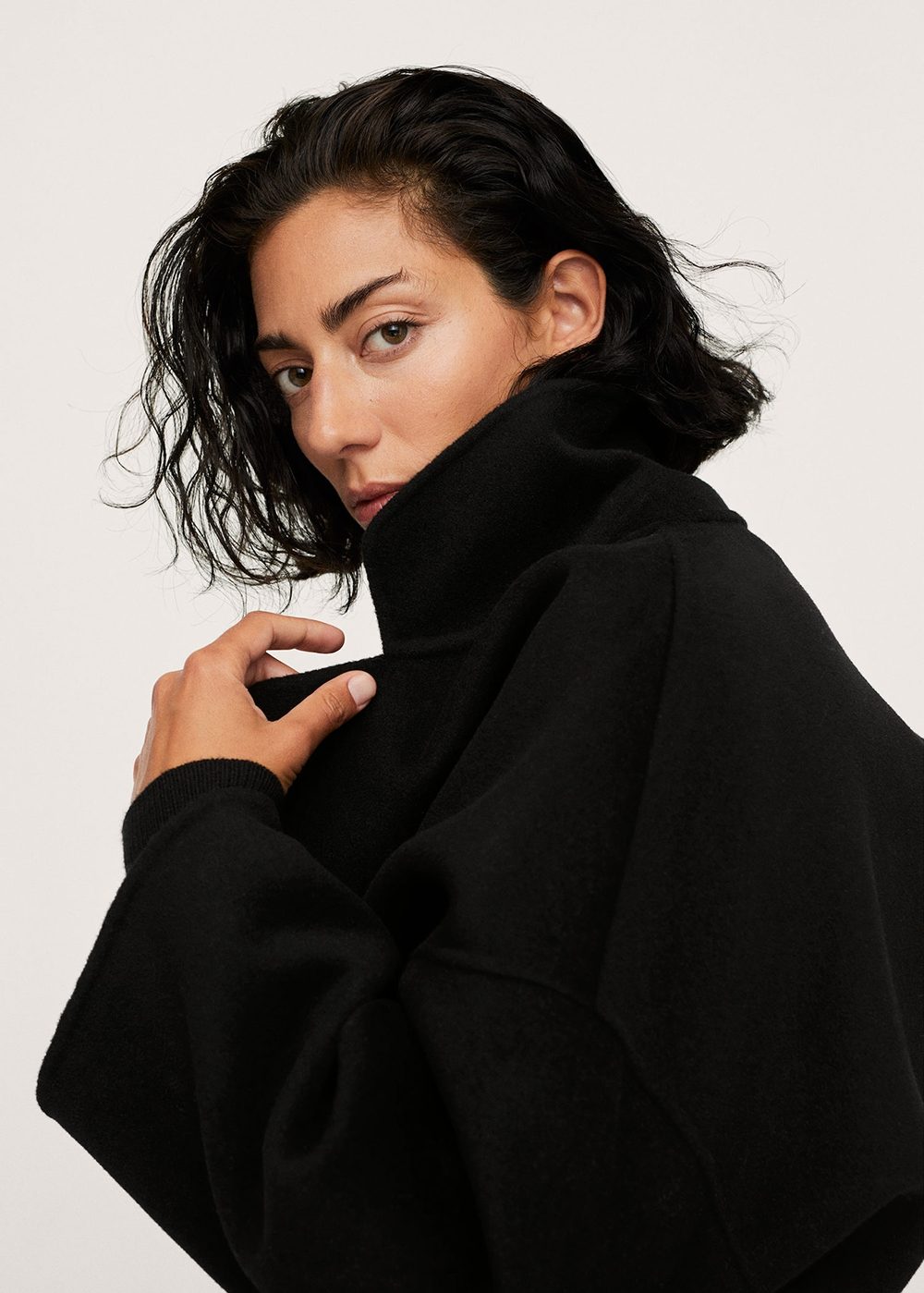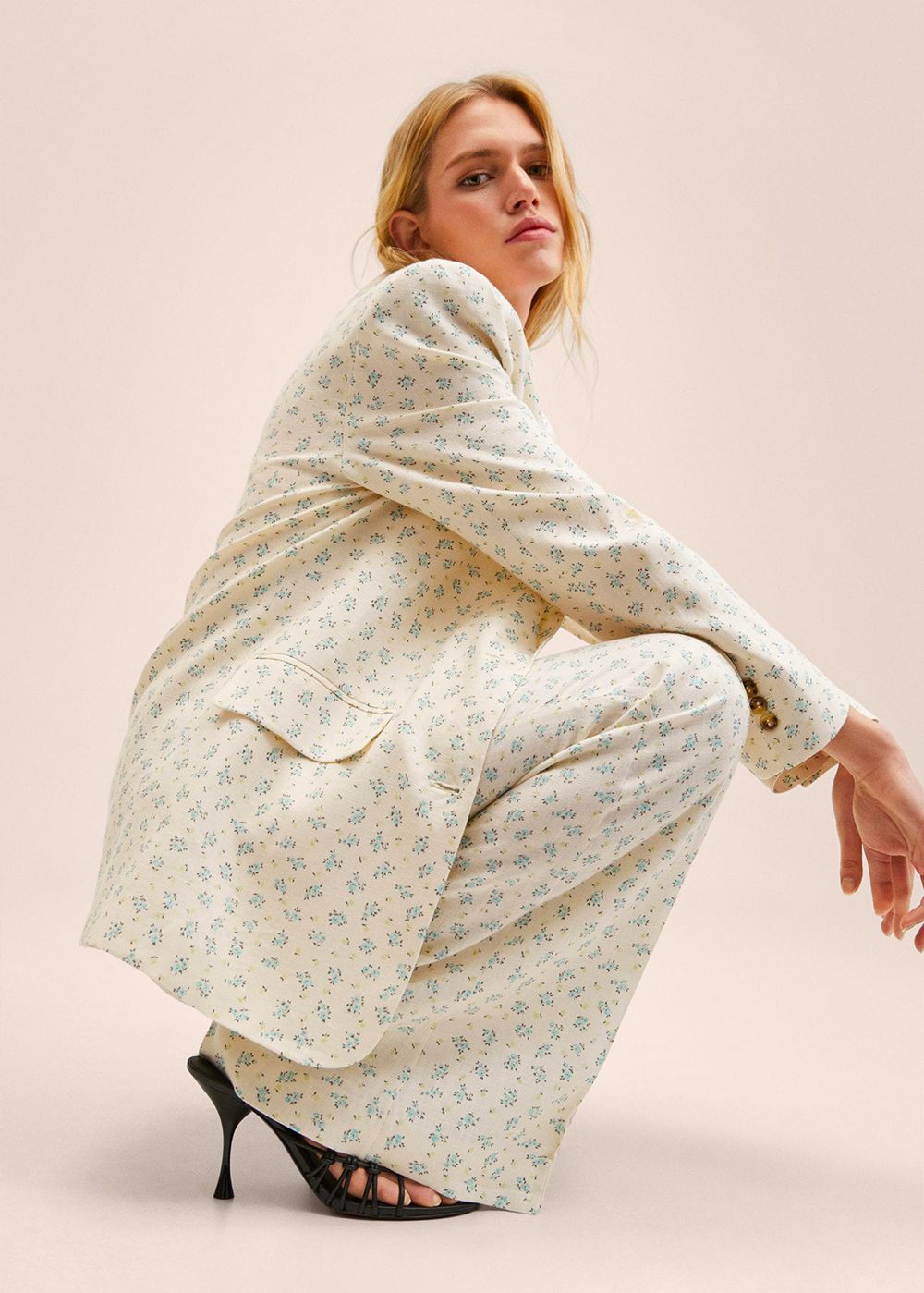 Cotton-blend fabric. Textured fabric. Long design. Evasé design. Wrap collar. Puffed short sleeve. Front slit. Knot detail. Bow closing on the back. Button fastening at back.